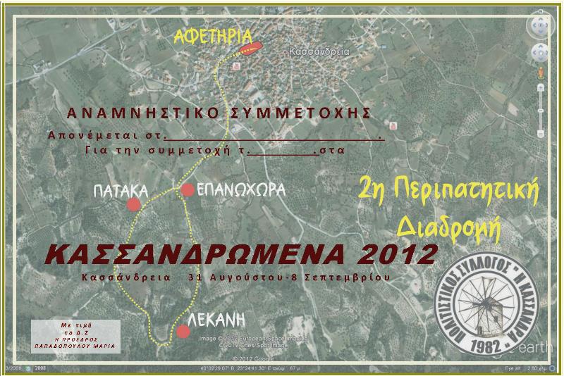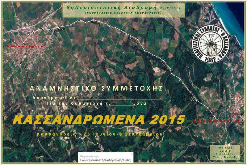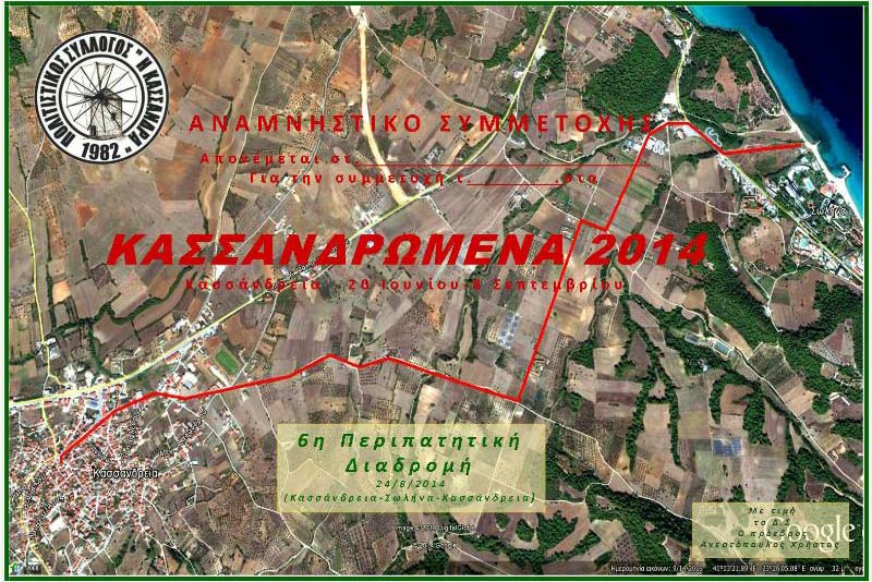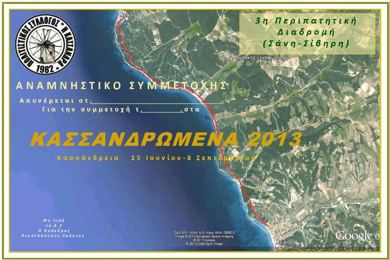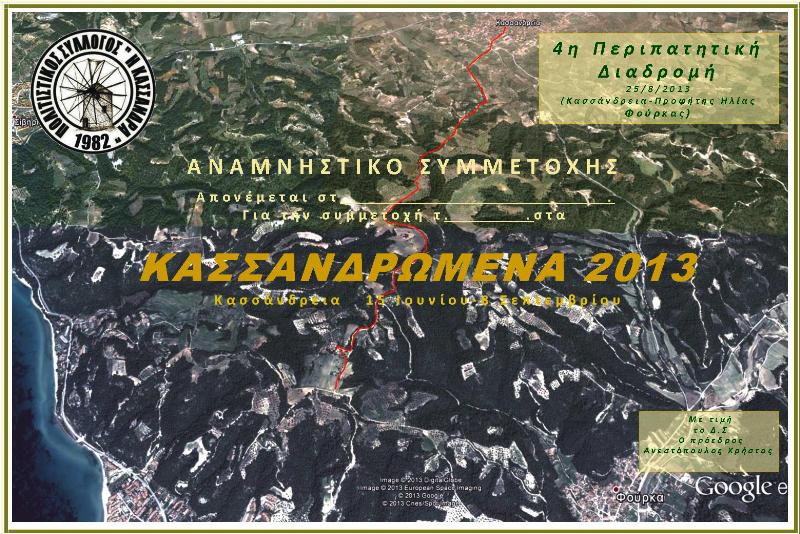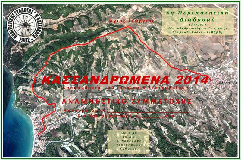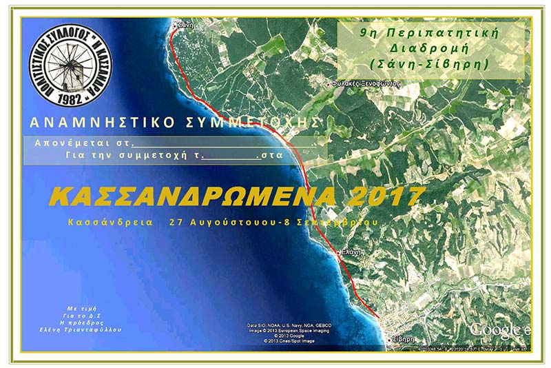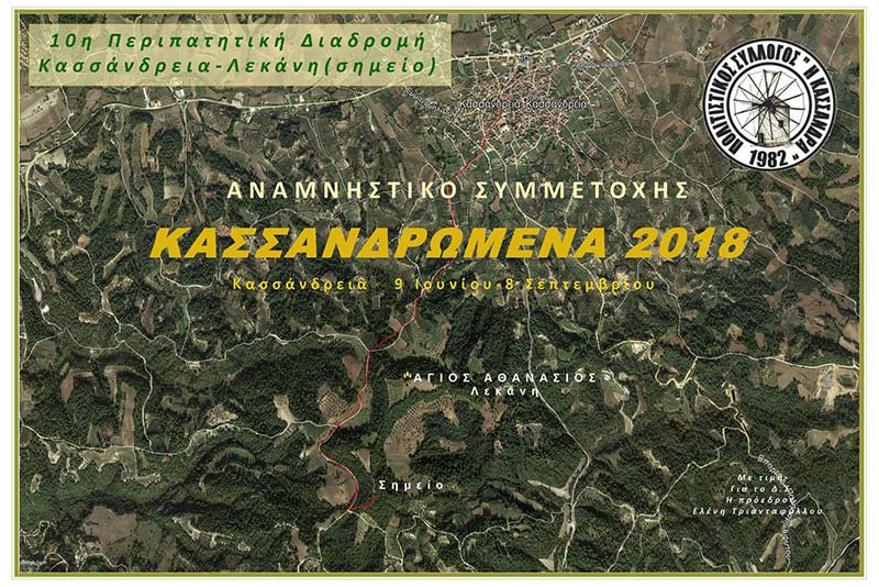 ● 27 ΑΥΓΟΥΣΤΟΥ 2017: 9η Περιπατητική Διαδρομή Κασσάνδρας: Σάνη- Σίβηρη 9,5 χλμ.(Διεθνές μονοπάτι) ● 15 ΟΚΤΩΒΡΙΟΥ 2017: Το τμήμα πεζοπορίας του συλλόγου συμμετείχε στο 14ο πέρασμα Δραγουντέλη που πραγματοποιήθηκε στο Δήμο Σιθωνίας ● 26 ΑΥΓΟΥΣΤΟΥ 2018: 10η Περιπατητική Διαδρομή Κασσάνδρας: Κασσάνδρεια-Λεκάνη (Σημείο)9,4 Χλμ.(αγροτικός δρόμος). ● 21 ΟΚΤΩΒΡΙΟΥ 2018: Το τμήμα πεζοπορίας του συλλόγου συμμετείχε στο 15ο πέρασμα Δραγουντέλη που πραγματοποιήθηκε στο Δήμο Σιθωνίας.