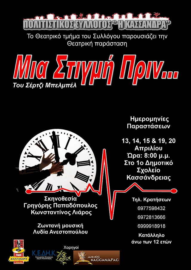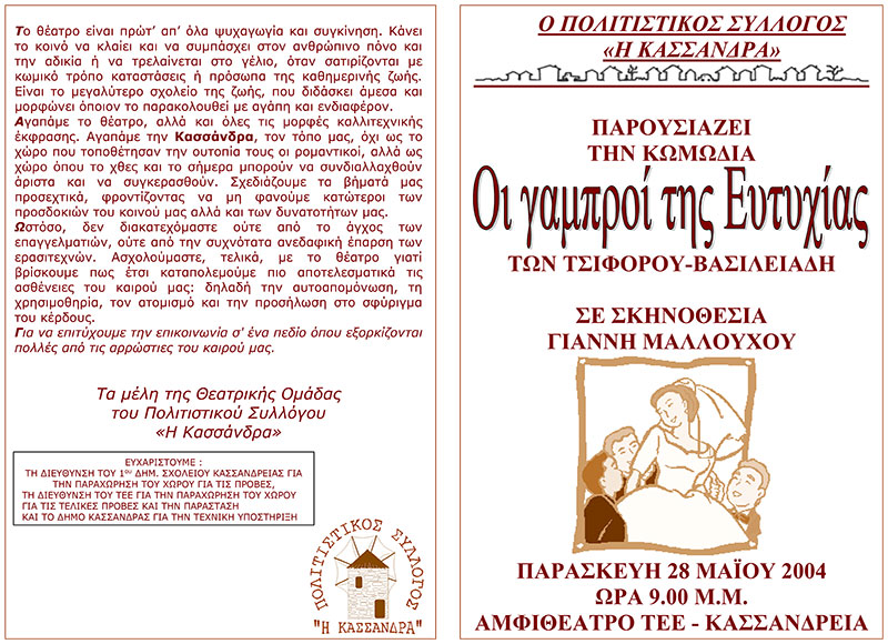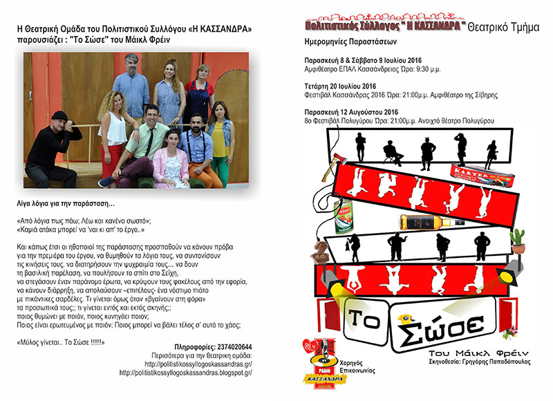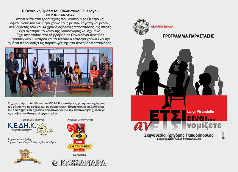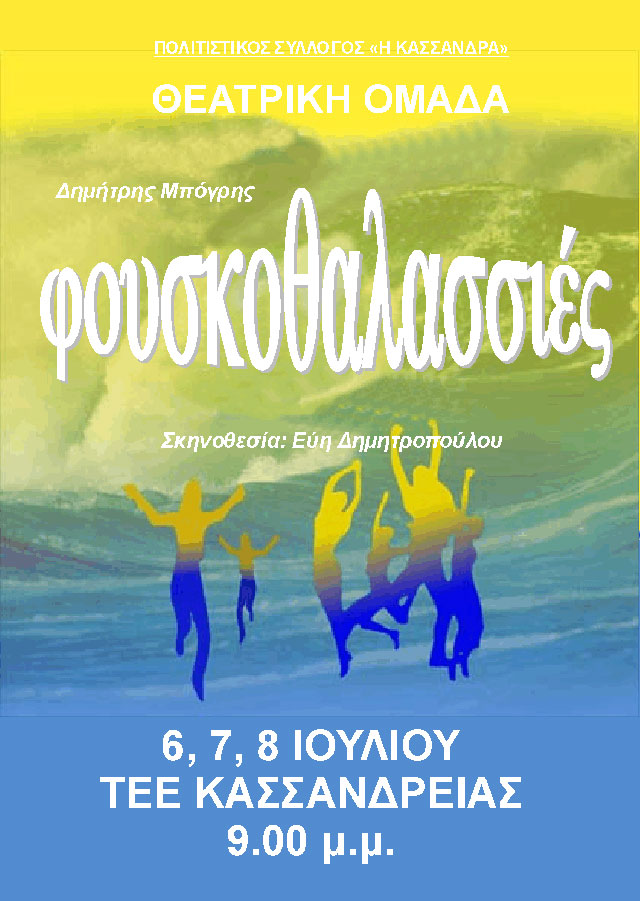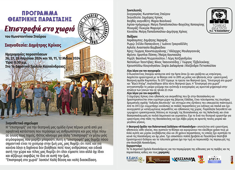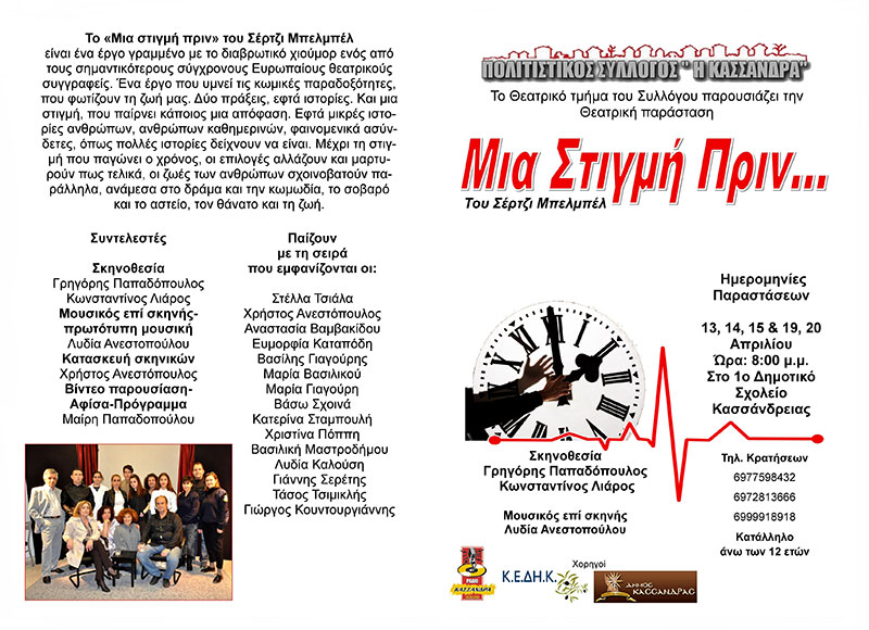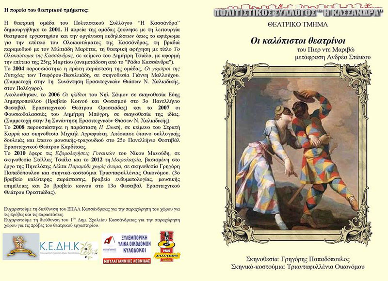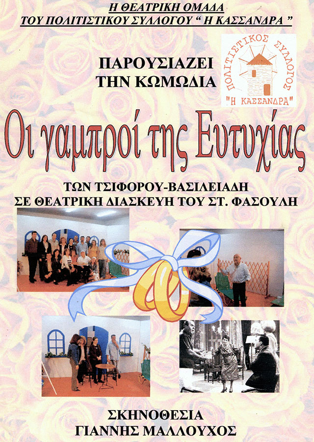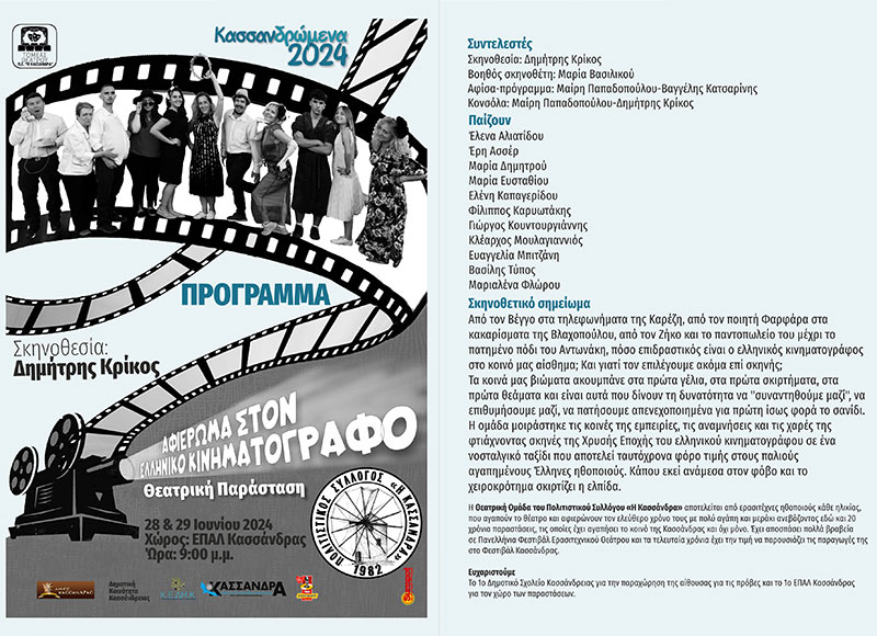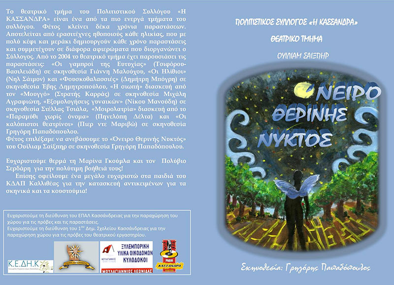 2001-2002 : λειτούργησε Θεατρικό εργαστήρι και οργανώσαμε εκδηλώσεις, όπως η επέτειος του Ολοκαυτώματος της Κασσάνδρας , βραδιά παραμυθιού με τον Μιλτιάδη Μαρέττα κ.ά.…